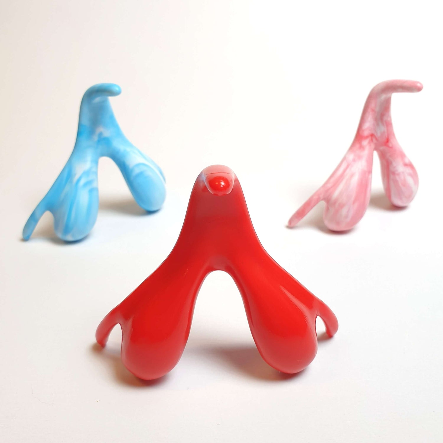 Klitoriser til bruk i opplysningsarbeid i samarbeid med Sex og samfunn. Klitorisene er laget av 100% resirkulert plast.