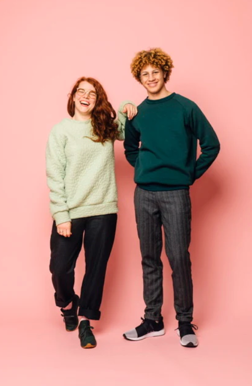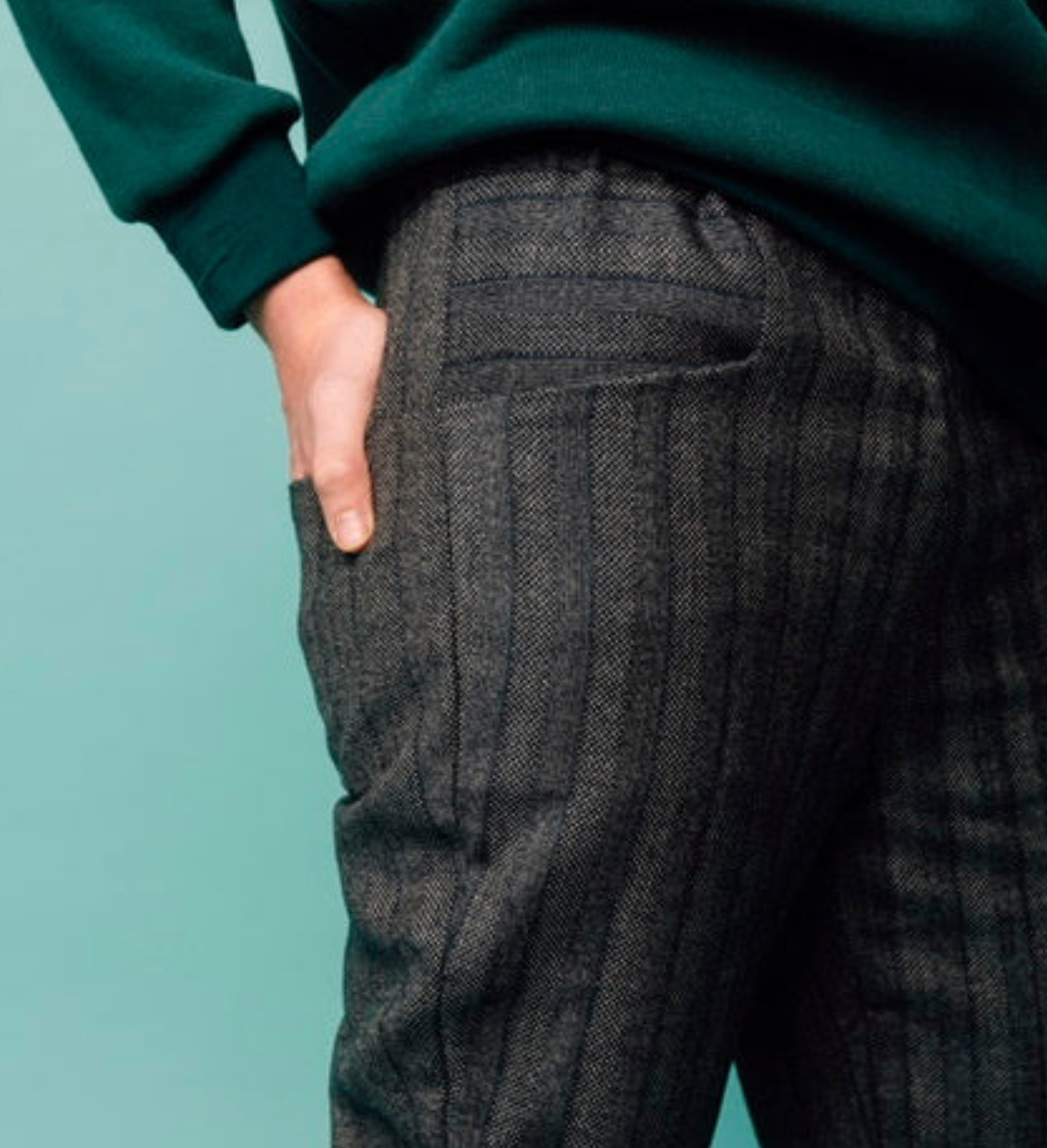 Huy er en pyntet, men behagelig bukse med strikk i midjen. Den har interessante lommer foran og bak, der hele lommeposen er i en bit. Du kan velge mellom vide eller smale bein. Buksa er overraskende enkel å sy.