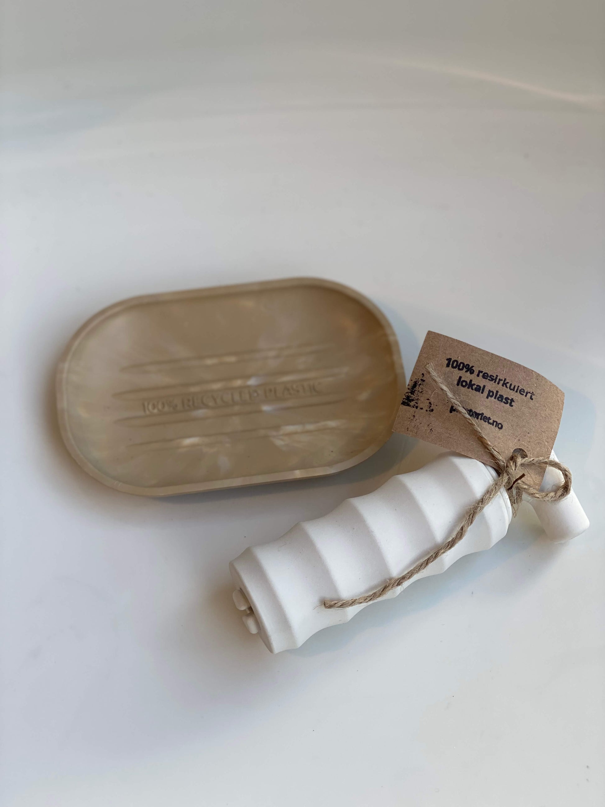 Du får en såpekopp i fargen Beige og en Klemmi i fargen Hvit