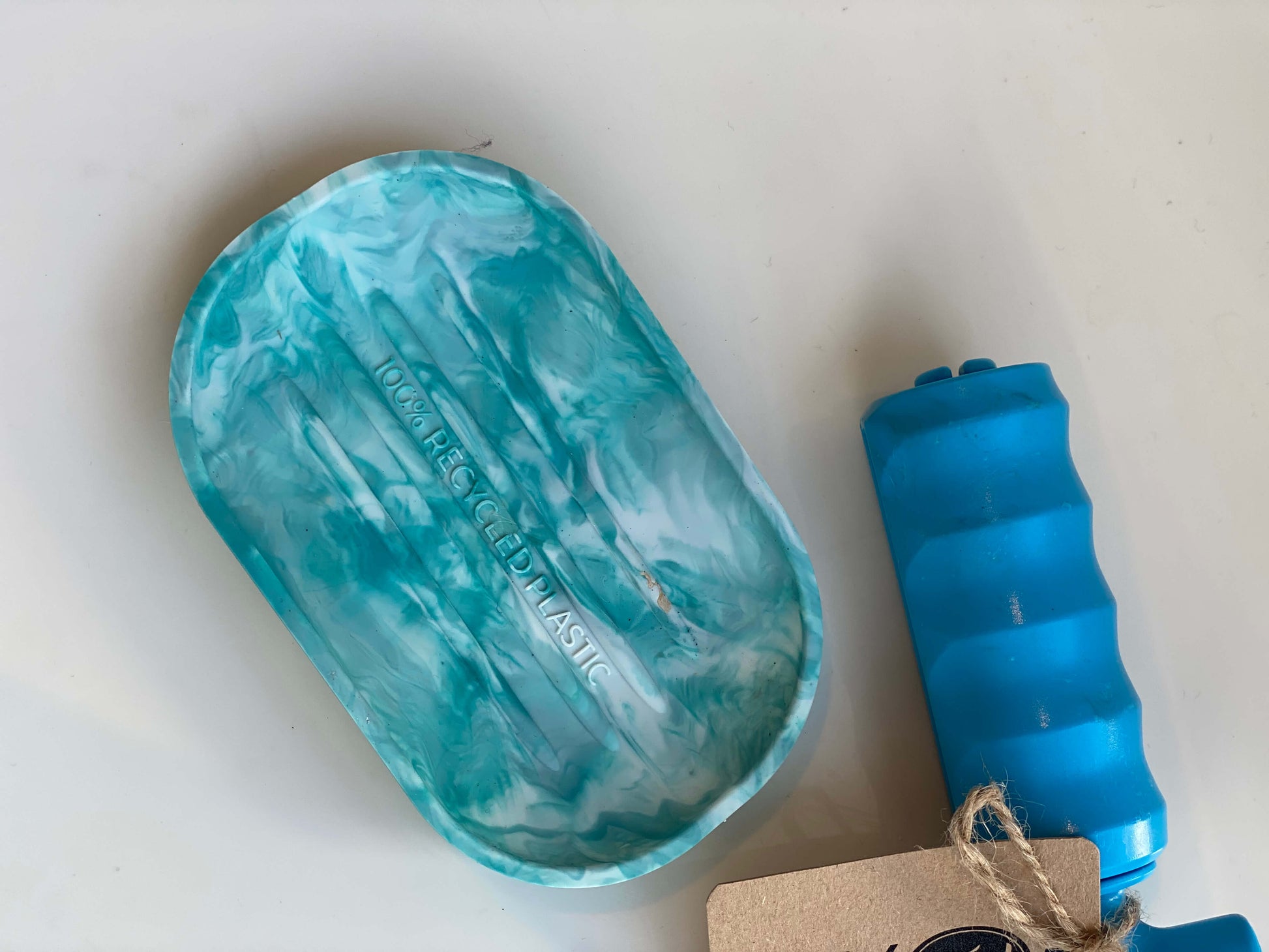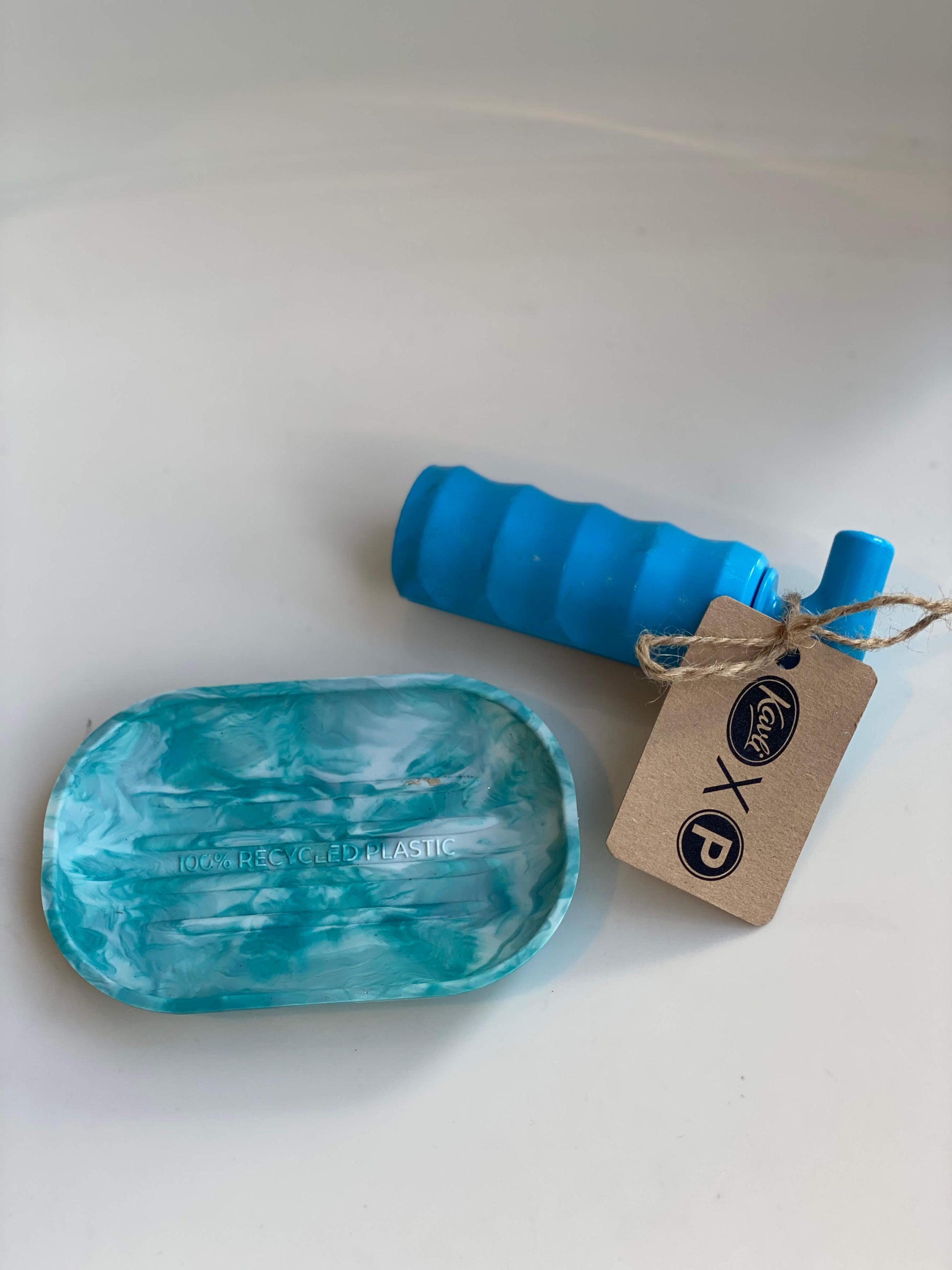 Du får en såpekopp i fargen turkis og en Klemmi i fargen blå